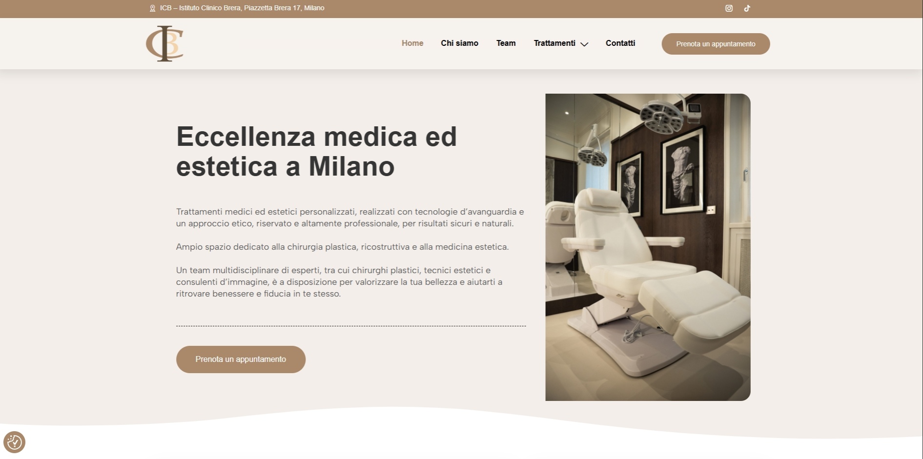Istituto Clinico Brera (ICB) è un centro medico d’eccellenza situato nel cuore di Milano, specializzato in Chirurgia Estetica, Medicina Estetica e Laserterapia. Il portale è stato progettato per riflettere il posizionamento “luxury” della clinica, offrendo un’esperienza utente che comunica professionalità, discrezione e innovazione tecnologica nel settore del benessere e della cura della persona.