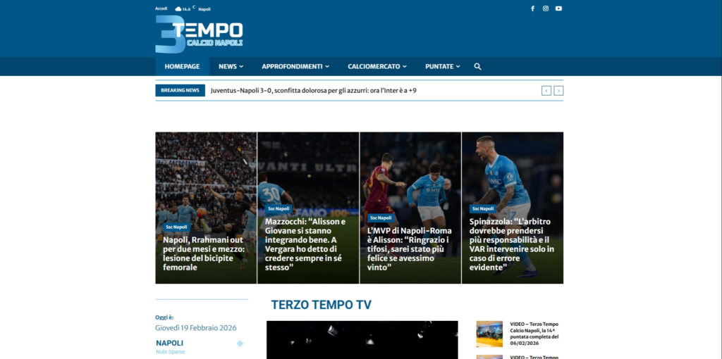 Terzo Tempo Calcio Napoli è un portale d’informazione sportiva verticale dedicato interamente alle vicende della SSC Napoli. Il sito funge da hub editoriale per news in tempo reale, approfondimenti tattici e aggiornamenti dell’ultima ora, rivolgendosi a una community attiva di tifosi che cercano contenuti rapidi e facilmente fruibili.
